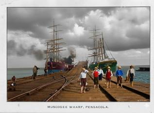 Although we do not have the manifest for that voyage, we do know that in 1906, the port of Pensacola, was a major, bustling hub for the export of forestry products, with lumber being one of the primary cargoes loaded onto ships. During this period, the city had become the state of Florida’s premier lumber centre, with numerous sawmills producing finished timber for export in vast amounts shipped from the city’s 16 major wharves. Another important export was coal from Alabama and both commodities were loaded into ships on Muscogee Wharf.